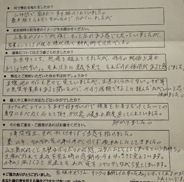 このたび工事をご依頼してくださったT様からアンケートをいただきました。